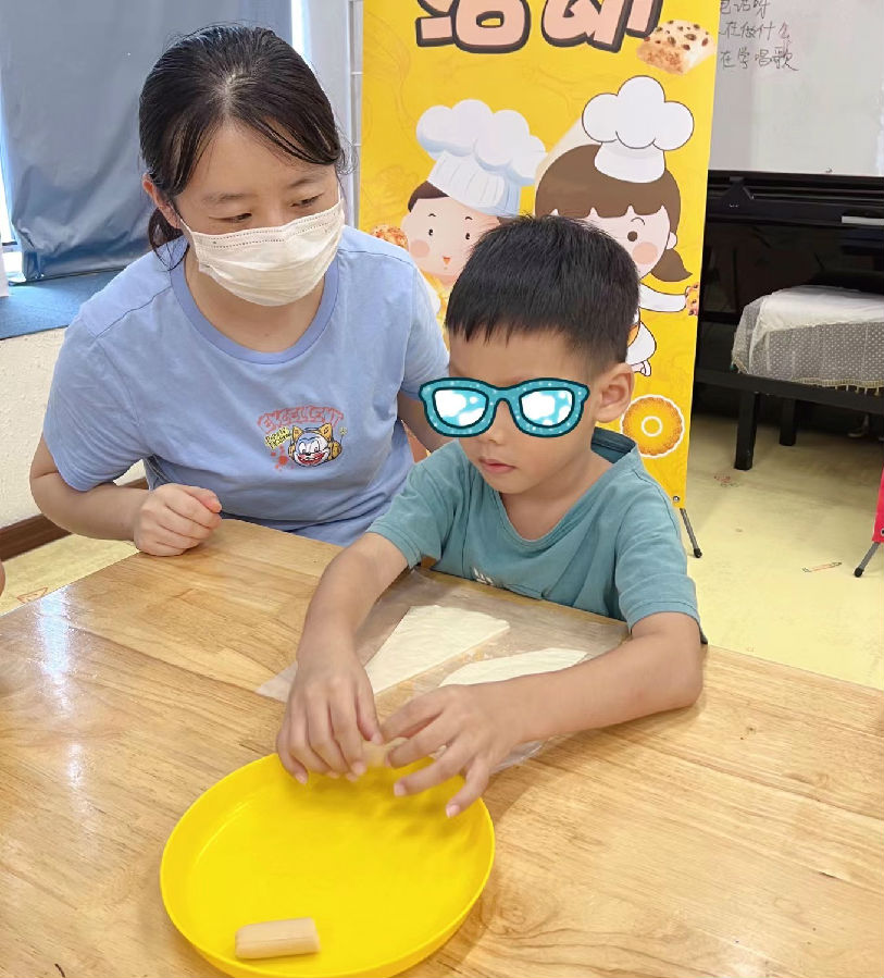 活動現(xiàn)場,來自康芝紅臉蛋基金和廣州市心友心智障礙者服務(wù)協(xié)會的志愿者們手把手教20名自閉癥兒童動手制作香腸面包。志愿者首先為孩子們準(zhǔn)備好制作香腸面包的材料及工具,并認(rèn)真地介紹了制作面包的流程,而孩子們天生充滿了好奇心,在志愿者講解的過程中,就已經(jīng)迫不及待開始大展身手了。
