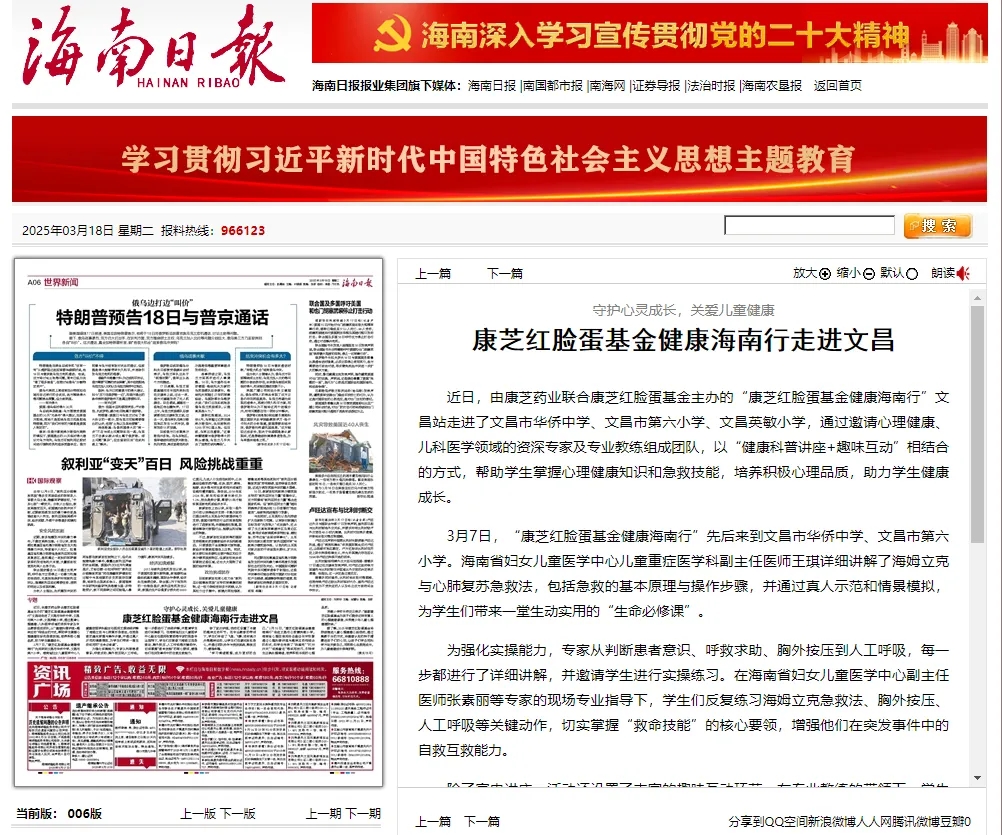 少年強(qiáng),則國強(qiáng)。為認(rèn)真貫徹黨的二十大精神,積極響應(yīng)教育部等十七部門聯(lián)合印發(fā)的《全面加強(qiáng)和改進(jìn)新時(shí)代學(xué)生心理健康工作專項(xiàng)行動(dòng)計(jì)劃(2023—2025年)》,助推海南省人民政府關(guān)于《海南省兒童發(fā)展規(guī)劃(2021—2030年)》等文件精神的落實(shí),近日,由康芝藥業(yè)聯(lián)合康芝紅臉蛋基金主辦的“康芝紅臉蛋基金健康海南行”文昌站走進(jìn)了文昌市華僑中學(xué)、文昌市第六小學(xué)、文昌英敏小學(xué)?;顒?dòng)引發(fā)熱烈的社會(huì)反響,不僅收獲師生的一致好評(píng),還得到海南日?qǐng)?bào)、中華網(wǎng)、鳳凰新聞、新華報(bào)業(yè)網(wǎng)等知名媒體的報(bào)道及轉(zhuǎn)發(fā)。
