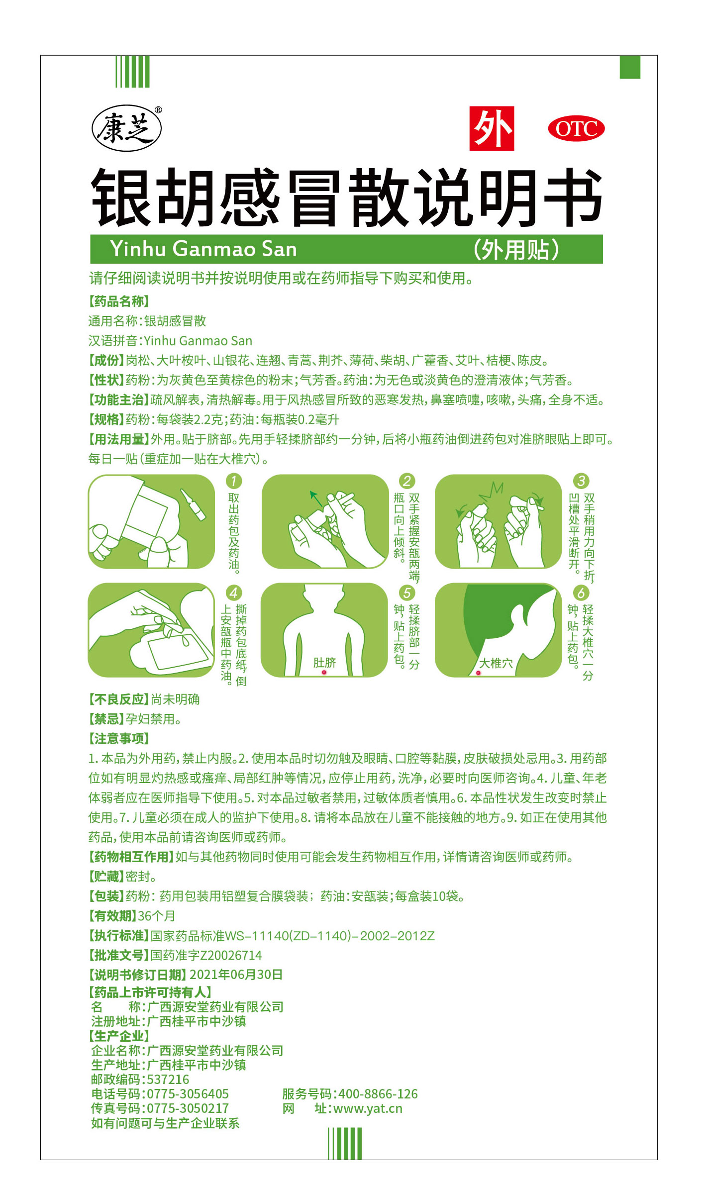 1、 2貼;3貼;5貼;10貼; 2、銀胡感冒散研制于1996年源安堂藥業(yè),其組方出自《溫病條辨》—“銀翹散”基礎(chǔ)上加減,并巧妙加入壯醫(yī)特色藥材崗松、大葉桉葉、青蒿、荊芥等富含揮發(fā)油藥材,通過獨(dú)特制備工藝將揮發(fā)油精制成藥油,形成創(chuàng)新藥粉+藥油混合的給藥方式,制成屬于散劑的外用貼,在治療感冒發(fā)燒領(lǐng)域獨(dú)樹一幟,開創(chuàng)先河。